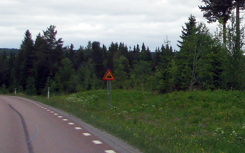 Es ist wenig los, teilweise kommt eine halbe Stunde kein Fahrzeug entgegen. Zwischendurch liegen links und rechts der Fahrbahn Autowracks, deren Abtransport sich wohl schlicht nicht lohnt. Und wir bekommen es mit den ersten unreparierten Frostbeulen auf der Straße zu tun. Es gibt zwischendurch zwar immer wieder Baustellen, diese lange Straße jeden Sommer zu flicken ist aber eine Sisyphusarbeit. Zusätzlich halten Waldarbeiter-Teams den Bewuchs abseits der Straße kurz. Schließlich will man kreuzende Elche frühzeitig entdecken. Beide dieser Instandhaltungsmaßnahmen kann man in der Nähe von Ortschaften beobachten.
