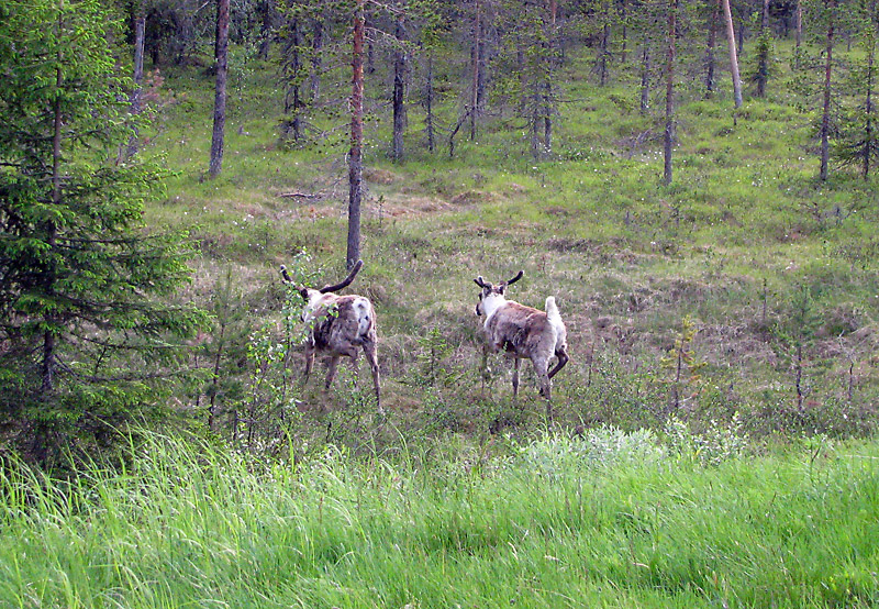 Bei Dorotea überqueren wir die Grenze zu Lappland. Jetzt sind wir im Siedlungsgebiet der Samen, die mit ihrer Kultur den Nordteil ganz Skandinaviens prägen. Da dauert es auch nicht lange, bis wir den ersten Rentieren begegnen. Die Tiere leben frei und sind halb domestiziert, gehören also jemandem. Die, denen wir begegnen, wollen sich nicht fotografieren lassen. Fährt man vorbei, bleiben sie am Straßenrand stehen, laufen manchmal sogar auf die Fahrbahn. Wir bremsen um ein Foto zu machen und schon nehmen sie Reißaus.