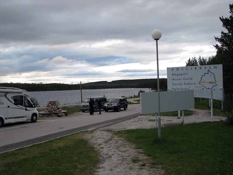 Etliche Kilometer und Landschaft weiter erreichen wir den Nordpolarkreis. Es gibt ein Besucherzentrum, ein großes Schild und ein kleines Denkmal. Mit einem Cache drin. Aber erst wollen wir ein Gruppenfoto machen. Ich stelle also das Stativ in einer Parkbucht auf und wir posieren. Jetzt rollt ein Wohnmobil heran, das genau in diese Parkbucht will. Wir stören uns nicht daran und machen ein paar Fotos mit dem Selbstauslöser. Ich hole das Stativ und das Wohnmobil rollt in genau diese Box. Warum wollen die ausgerechnet hierhin, es ist doch genug Platz? Nachdem wir den Cache gehoben haben und ihn wieder platzieren bekommen wir zu hören „Sehr gut, brauchen wir nicht mehr zu suchen!“ Es sind auch Cacher. Die haben sich gedacht, dass das ja dauern kann, mit den blöden Fotomuggles! Wir halten einen kurzen Geoschnack, tauschen ein paar Trackingnummern aus und dann geht es für uns auch schon weiter.