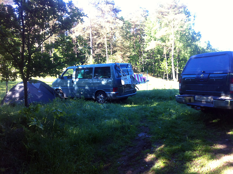 Ab Karlstad ist es dann wie abgeschnitten. Nichts mehr los auf der 45, wir durchfahren ausgedehnte Wälder. Ab und zu gibt es Seen entlang der Straße. Zahlreiche Brücken, unter denen wilde Flüsse tosen, überqueren wir. Ortschaften liegen jetzt merklich weiter auseinander. Das macht die Suche nach einem Schlafplatz einfach. Wir durchfahren eine Ortschaft, in diesem Fall Ytterhogdal, folgen der Straße noch ein paar Kilometer und biegen dann in eine Schotterpiste ab. Auf einer Kuppe ist ein leerer Polterplatz. Hier weht ein konstanter Wind, der die Mücken fernhält und genug Platz ist auch. Wir stellen die Autos als Windschutz auf und übernachten.