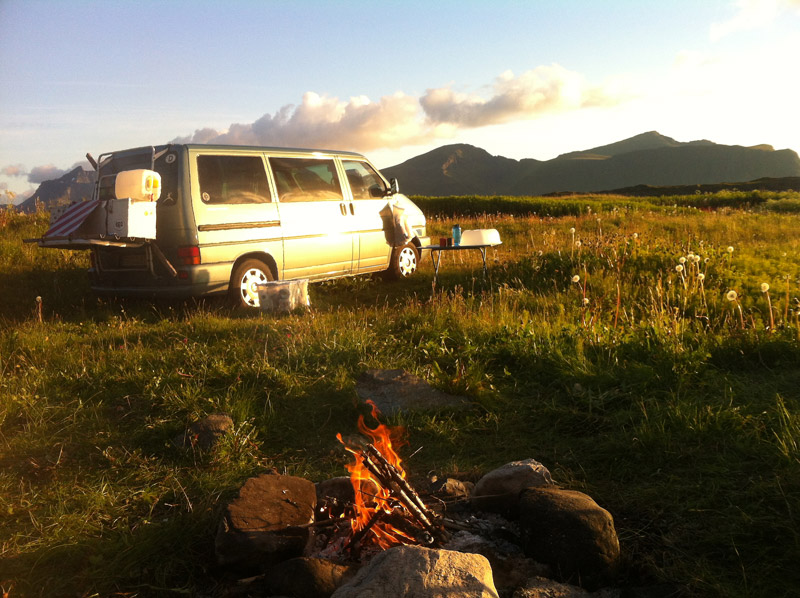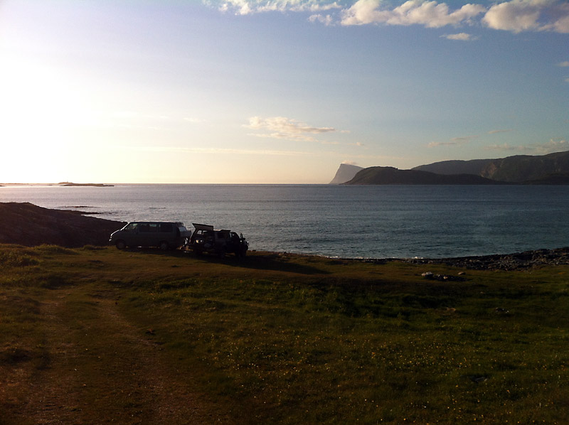 In dieser großartigen Landschaft werden wir dann fündig. Ein Weg führt von der Straße zum Meer herunter. Es gibt einen tollen Lagerplatz (N68° 06.243 E13° 15.127), wieder direkt am Felsenstrand. Wieder mit Blick nach Norden. Hier sind wir umringt von Bergen und genau zwischen zwei Orten. Es gibt genug Platz. Sogar Brennholz findet sich in der Nähe, so dass wir am Abend ein Feuer entfachen.