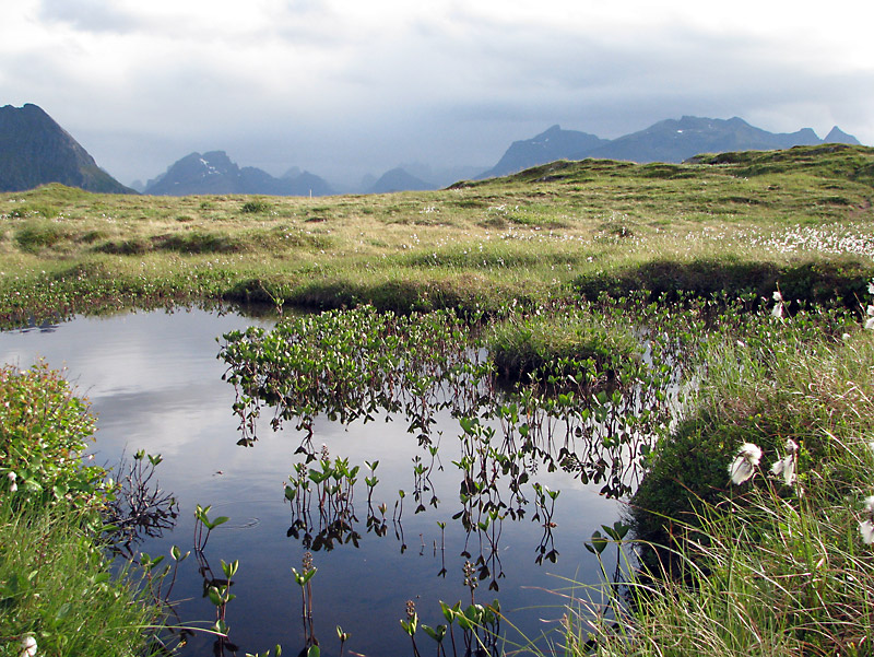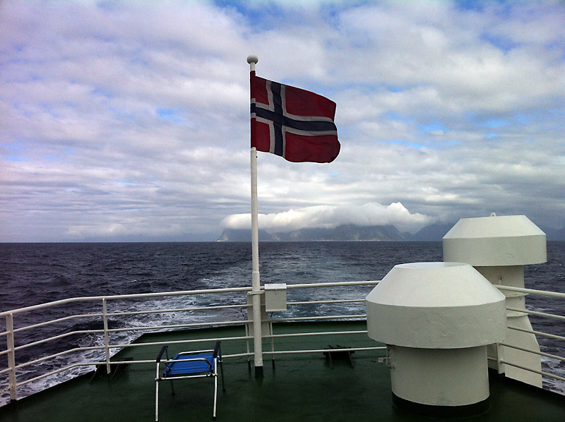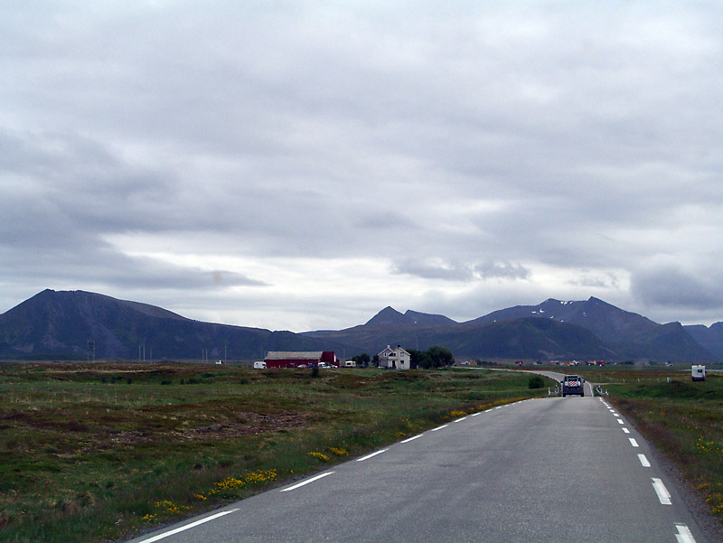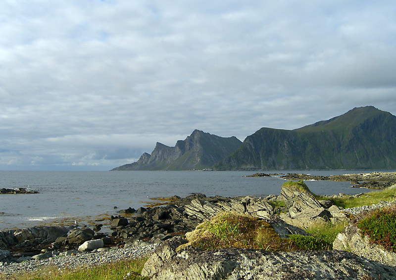 So sind wir nun endgültig an der berühmten Südspitze der Lofoten angekommen. Die Sonne scheint und weiße Wolken werden von einem frischen Wind über den weiten Himmel getrieben. Eben haben wir die kleine Kirche bei Flakstad angeschaut. Am Horizont deutet sich Ramberg an.