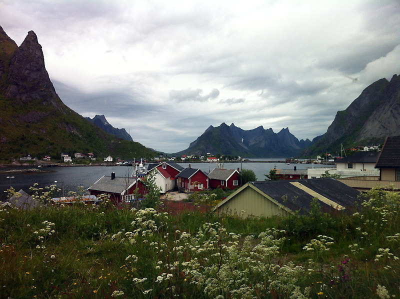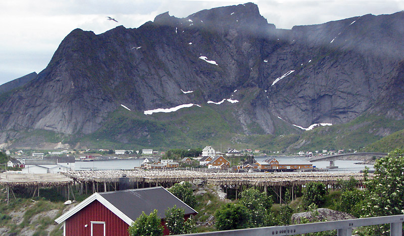 Wir durchqueren Fischerdörfer, passieren ausgedehnte Tørrfisk-Anlagen und haben noch einmal tolle Ausblicke auf die zerklüftete Südspitze der Lofoten. Wir suchen zwei Caches, finden aber nur einen und machen Halt im berühmten Reine, kurz vor Moskenes.
