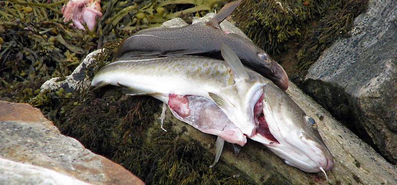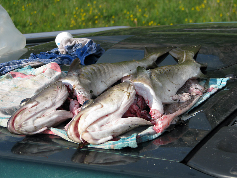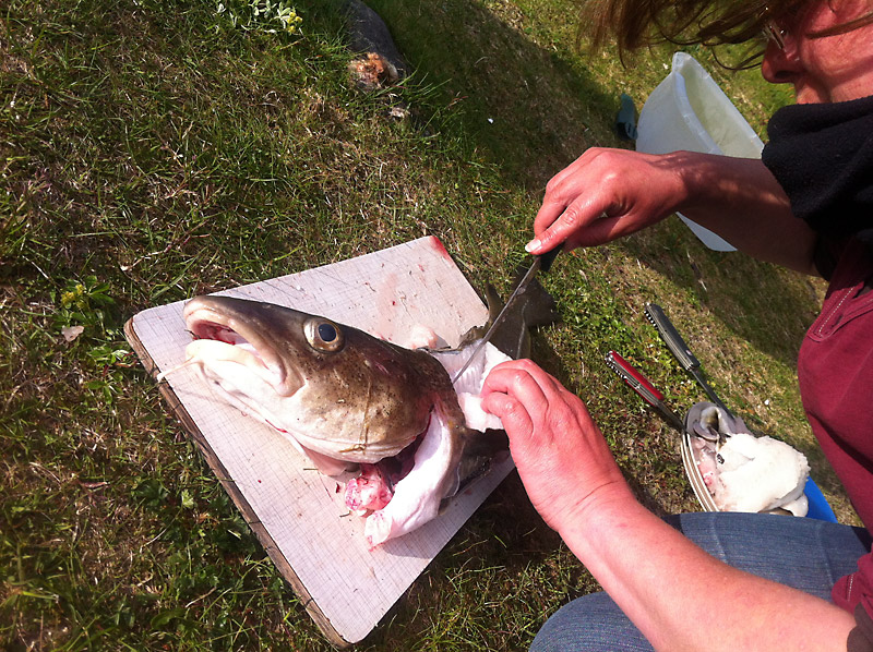 Es gibt drei große Dorsche und einen Köhler, die Haiko eben gefangen hat. So frischen Fisch haben wir noch nicht gegessen. Einfach so auf dem Grill zubereitet braucht er keine weitere Würze; nur ein bisschen grobes Salz. Köstlich!