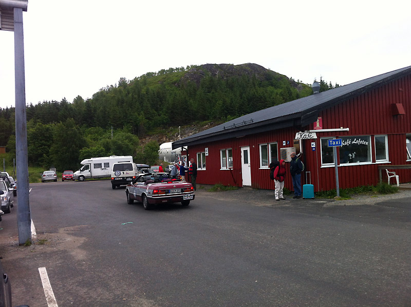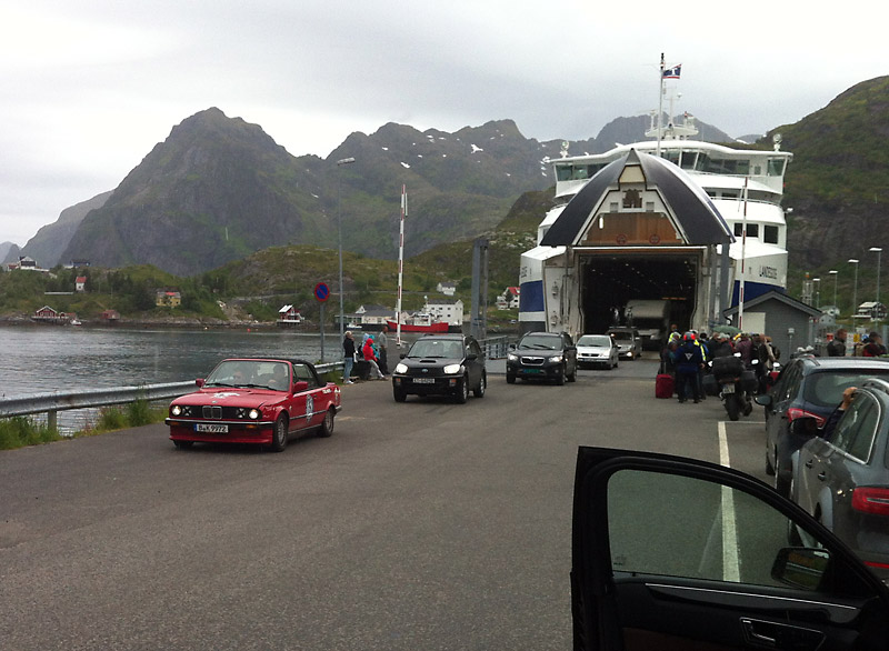 In Moskenes reihen wir uns in die Fähr-Warteschlange ein und vertreiben uns die Wartezeit mit Kaffeetrinken und Reisemobile gucken. Als die Fähre anlegt, sind unter den ausfahrenden Autos auch einige Teams der Baltic Sea Circle Rallye. Das interessiert uns besonders, schließlich sind Freunde von uns im Frühjahr die Allgäu-Orient mitgefahren. Wer aber 7500 km in 15 Tagen fahren muss, der hat keine Zeit zum Anhalten.