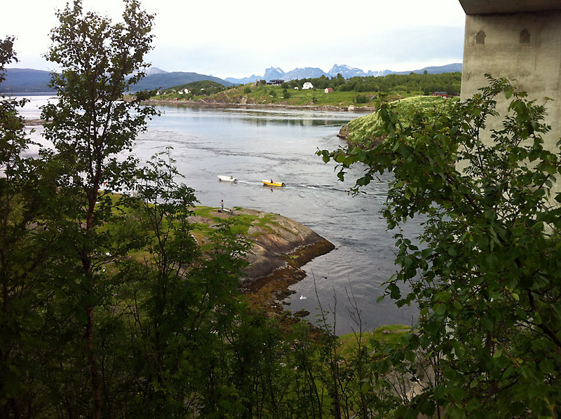 Hinter Bodø passieren wir den berühmten Gezeitenstrom Saltstraumen. Ganz schön was los hier. Wir schauen uns das Gegurgele der Meerenge eine Weile an, heben den örtlichen Cache und machen dass wir fortkommen.