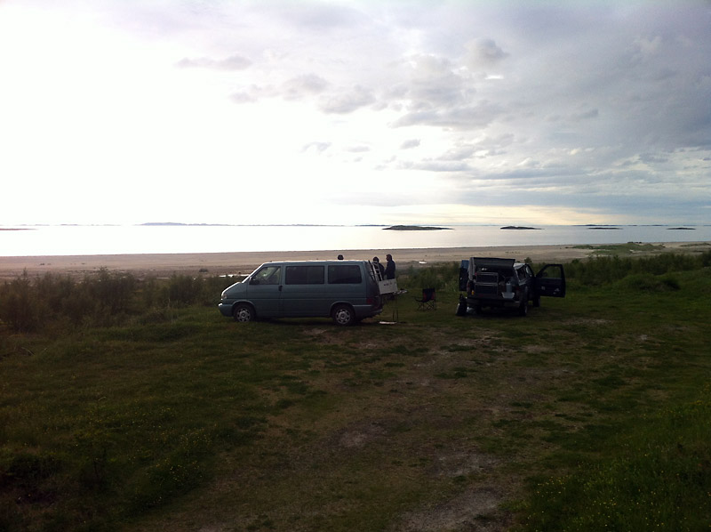 Das Lager befindet sich bei Sandvik auf Sandhornøya. Wir fahren über die Brücke auf die Insel. Es ist wenig los. Ein paar Häuser, ein Supermarkt. Über einen kleinen Pass geht es auf die andere Seite. Entlang der Straße erstreckt sich ein riesiger Sandstrand, von dem die Insel wohl ihren Namen hat. Etwas abseits der Straße, auf einer kleinen Grasfläche und direkt am Strand erspähen wir den Nissan. Auf der anderen Seite der Straße erhebt sich eine gewaltige Felswand. Tina und Haiko sind schon mit den Vorbereitungen für das Abendessen beschäftigt.