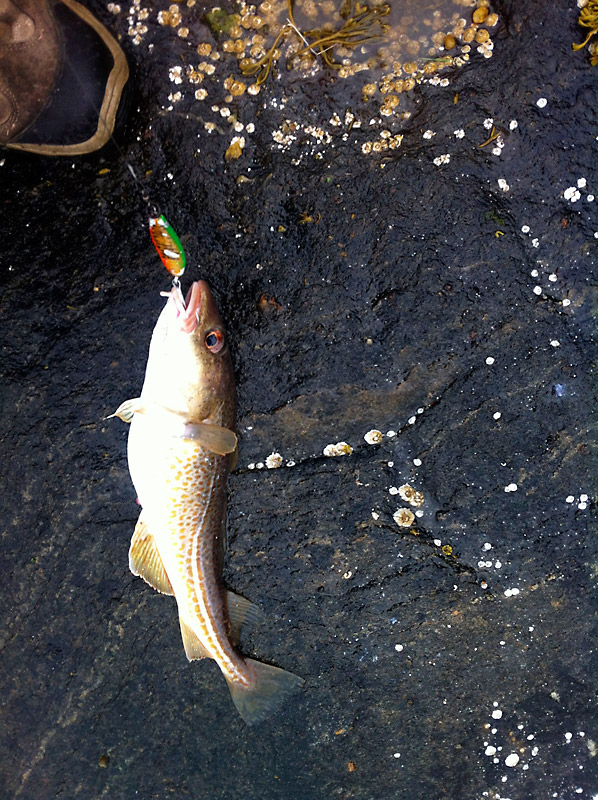 Mein allererster selbst gefangener Fisch. Zu klein, der darf zurück in den Fjord.