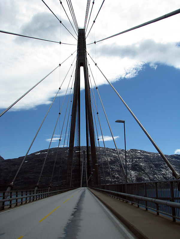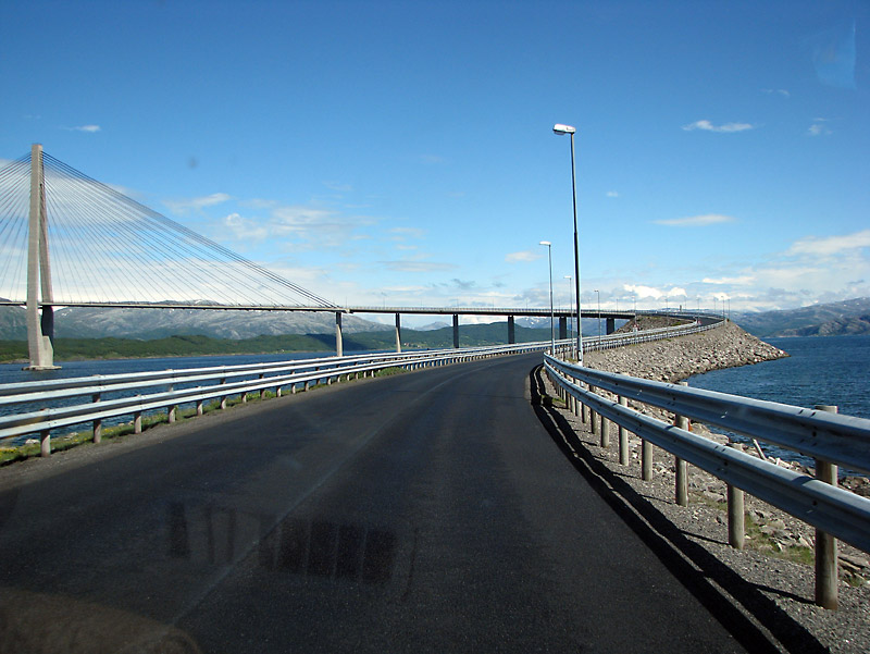 Von hier aus geht es jetzt weiter in Richtung Sandnessjøen. Kurz vor dem Städtchen überqueren wir die spektakuläre Helgelandsbrua, eine Brücke mit einer Kurve. Wir fahren drüber; unterwegs gibt es grandiose Aussichten. Am anderen Ende wenden wir: Nochmal, nochmal!