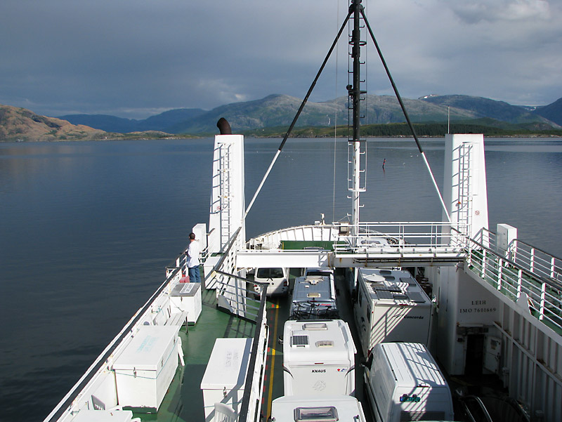 Auf der Suche nach einem Schlafplatz passieren wir eine geeignete Stelle, wo sich aber alle anderen Wohnmobile von der Fähre versammelt haben. Das muss dann auch nicht sein und wir schauen uns weiter um. Dann stehen wir am Fähranleger Åndalsvåg und beschließen, die kurze Überfahrt nach Horn auch noch heute zu machen.