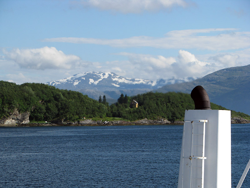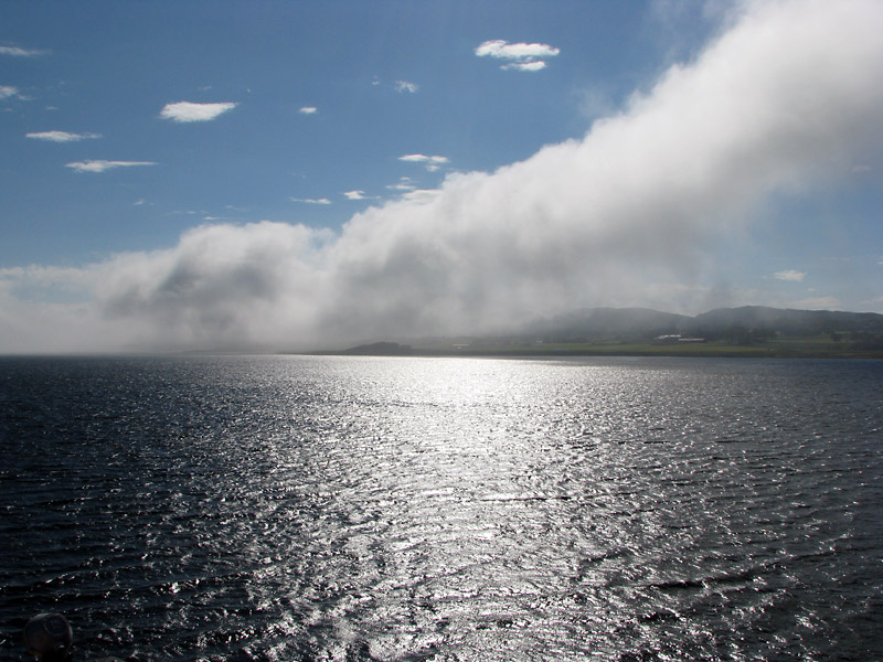 Die Fährüberfahrt ist herrlich. Es weht ein steifer Wind, aber die Sonne scheint. Zwischen der Insel Pålmyro und dem Festland liegt eine Wand aus Nebel. Kurz vor  Forvik wird sie uns verschlucken.