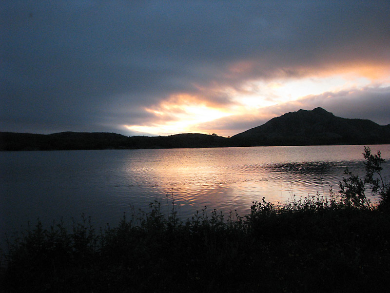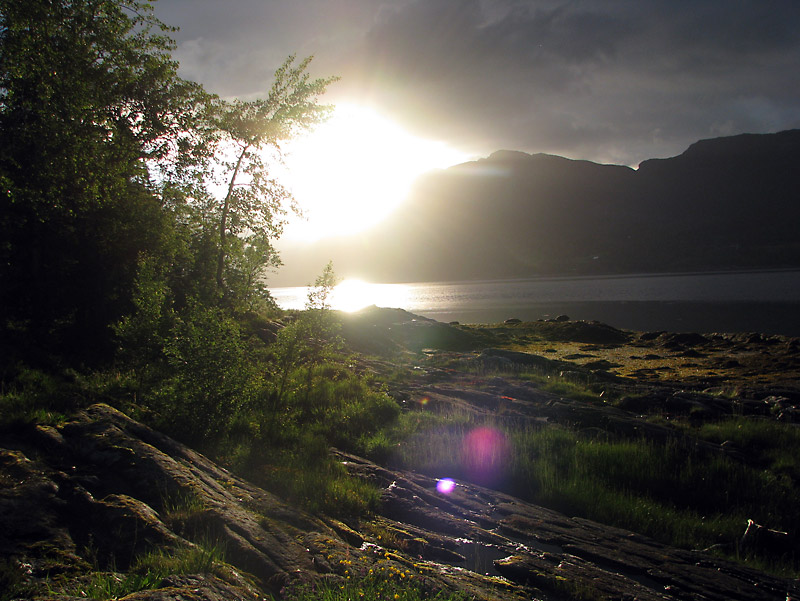 Wir fahren jetzt auf Brønnøysund, einer größeren Stadt, zu und wollen vorher noch ein schönes Plätzchen zum Pennen finden. Wir finden einen historischen Marktplatz mitten in der Pampa, einen Wanderparkplatz nahe der Straße und einen Süßwassersee mit einigen Ferienhäusern nahe des Ufers. Aber auch ein paar vielversprechenden Stellflächen direkt am Wasser. Wir treffen ein paar Leute, die in der Nähe einen Wohnwagen stehen haben. Sie meinen, es wäre kein Problem hier für eine Nacht zu „parken“, der Besitzer hätte sicher nichts dagegen. Und so war es dann auch. Wir stellen uns hin, haben einen Sonnenuntergang (ungewohnt inzwischen) und anschließend eine geruhsame Nacht.