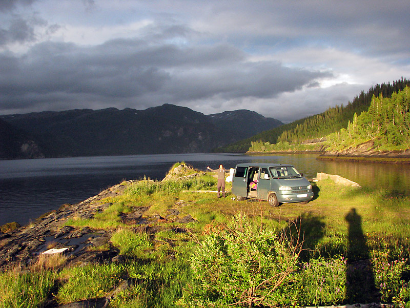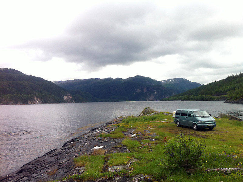 Es ist Nachmittag als wir in Holm eintreffen, trotzdem halten wir entlang der Strecke schon Ausschau nach einer Übernachtungsmöglichkeit. Wir sind ein bisschen erschöpft und möchten uns einfach ein wenig ausruhen. Ausserdem wollen wir versuchen, noch eine Nacht an einem Fjord zu verbringen. Kurz hinter Foldereit nehme ich im Augenwinkel  einen Weg wahr, der von der höher gelegenen Straße herunter zum Fjord führt. „Astrid, schau dich mal um. Ist da unten ein Haus?“ Da ist kein Haus.