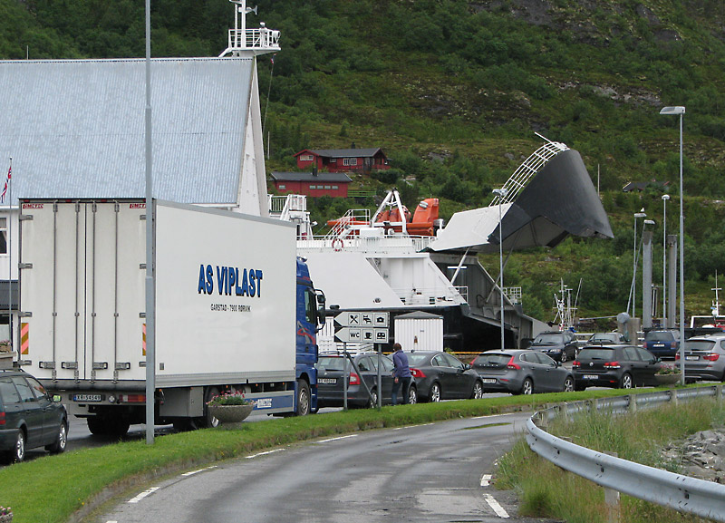 Am Fähranleger in Tjøtta liegt die Fähre zum Einfahren bereit. Zum ersten Mal erleben wir, dass eine Fähre voll ist und nicht alle mitnehmen kann. Uns auch nicht. Wir müssen warten, bis die Fähre zurück kommt. Kein Cache weit und breit, also kochen wir Kaffee und faulenzen im Bus.