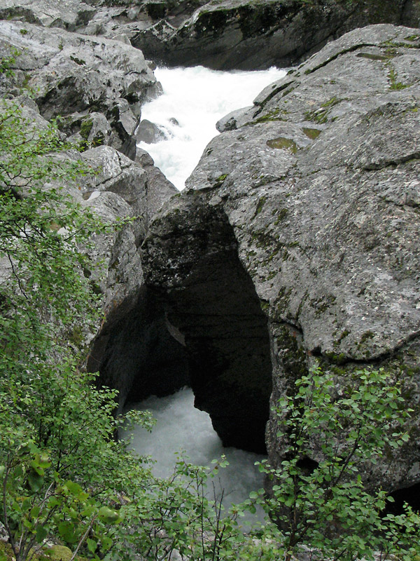 Auf der Strecke wollen wir die Pausen mit ein paar Caches verbinden. Da bietet sich der Magalaupet (GC2TAY3) an, eine Felsklamm, durch die der Fluss Svåne zwängen muss. Schon auf dem Weg zur Enge, der durch üppige Vegetation führt, kann man das Tosen der Wassermassen hören.