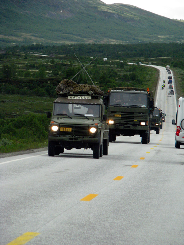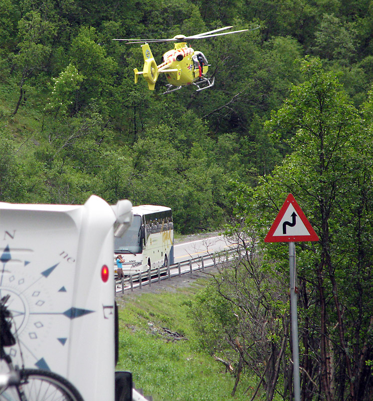 Weiter geht es die E6 entlang. Neben der Straße tost die Svåne. Es ist nicht viel Verkehr, aber plötzlich stehen wir im Stau. Einige hundert Meter vor uns hat es einen Unfall gegeben. Nur Minuten später braust ein Rettungshubschrauber heran, es scheint also ernst zu sein. Was wirklich passiert ist, finden wir nicht heraus, auch nicht als wir später die Unfallstelle passieren. Trotz der Abgelegenheit der Stelle haben die Rettungskräfte in Windeseile ganze Arbeit geleistet.