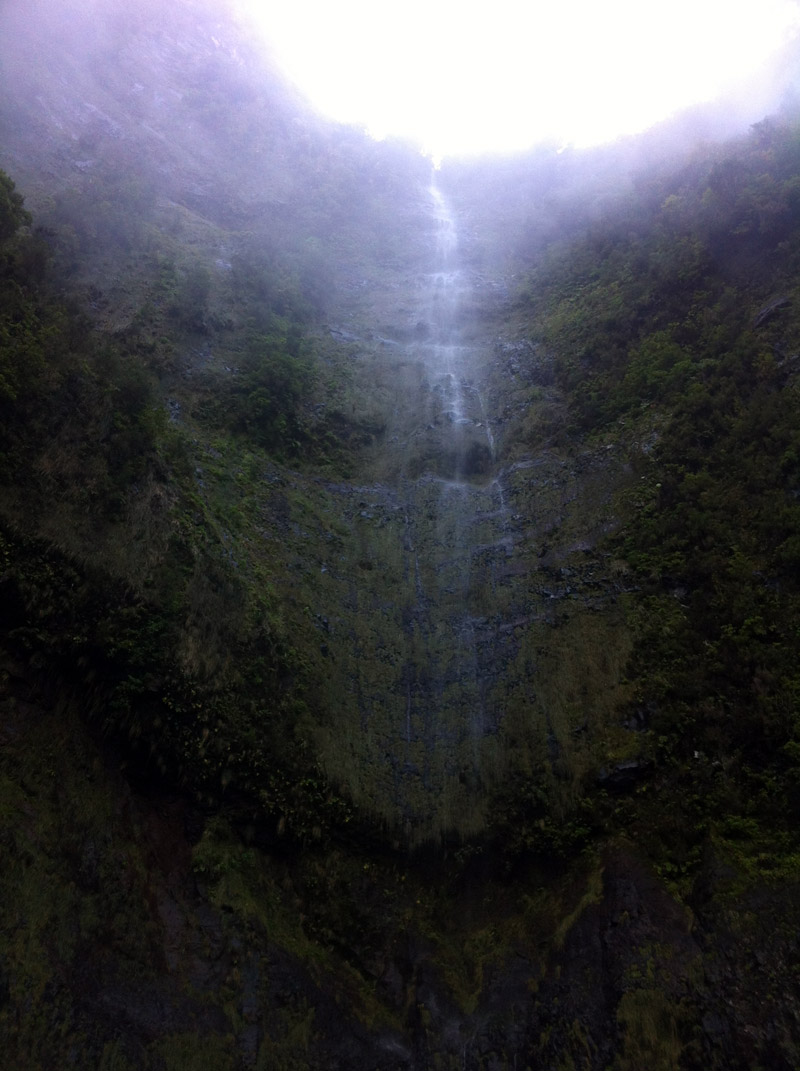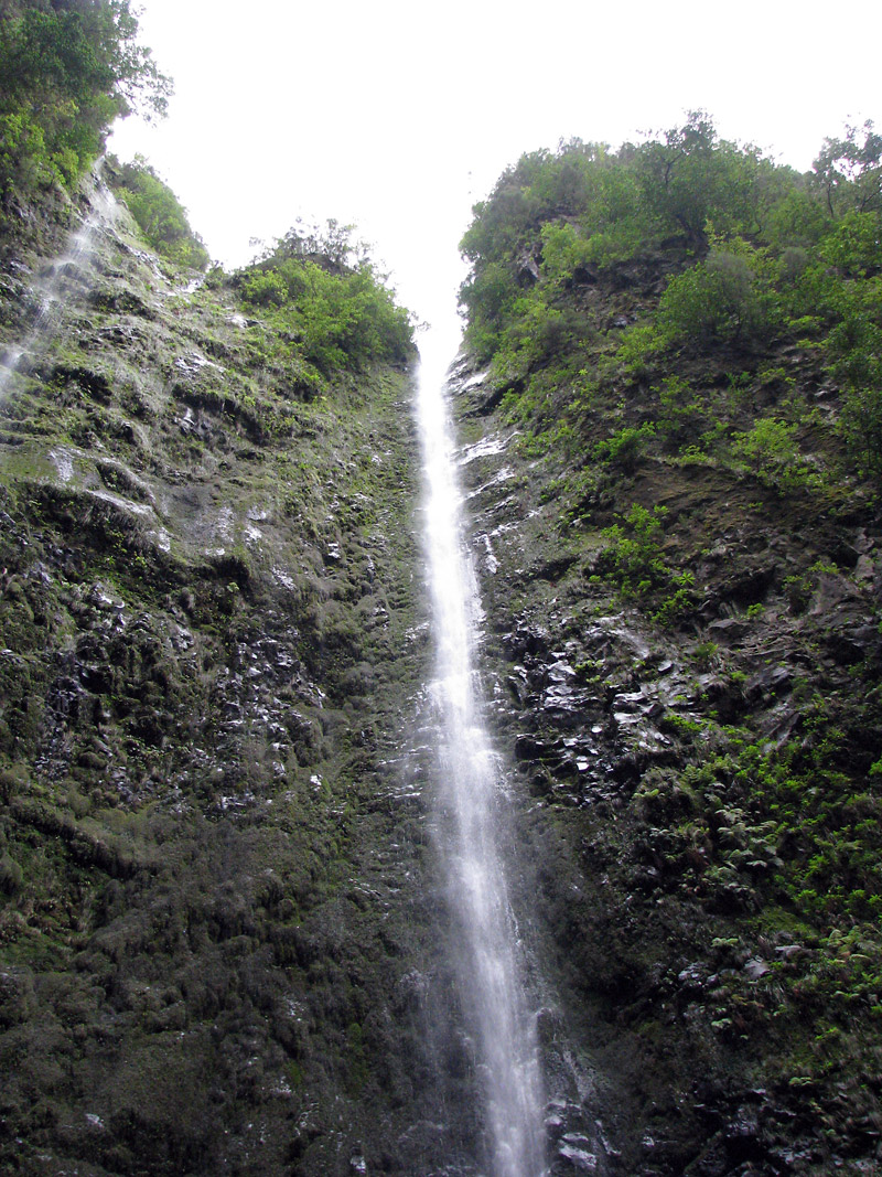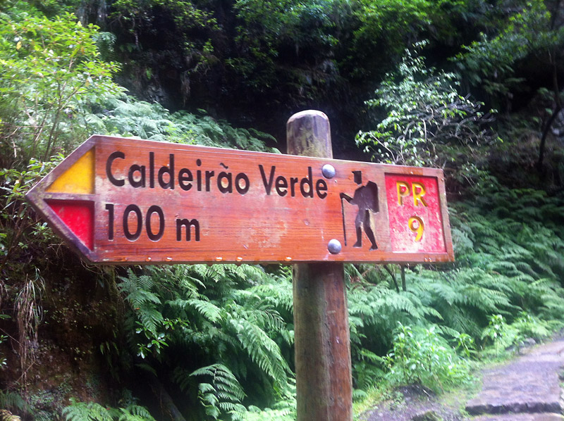 Wir wandern einige Kilometern durch großartige Landschaft. Immer wieder gibt es einen Regenschauer. Wir machen uns mit den Gegebenheiten und der Höhe vertraut. Als wir den Caldeirão Verde erreichen, ist es aufgeklart. Ein Schild zeigt den Berg hinauf, noch wirkt alles nicht so spektakulär. Aber als wir nach hundert Metern im Talkessel stehen, sind wir überwältigt. Ein riesiger Wasserfall ergießt sich in ein Becken. Durch die Enge des Talkessels wirkt alles noch monumentaler.
