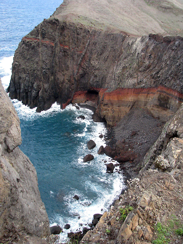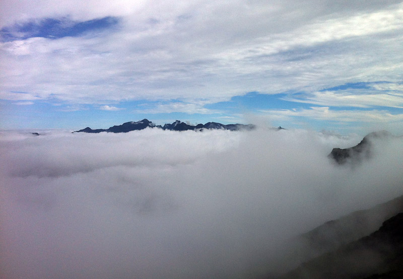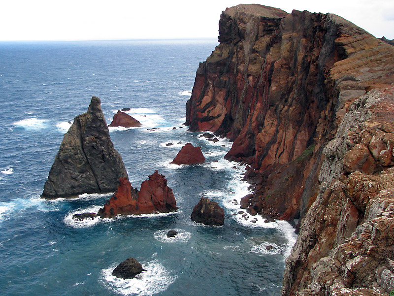 An der Landbrücke, die die Halbinsel mit der Hauptinsel verbindet, bekommen wir das Mikroklima wieder zu spüren. Der Wind frischt auf, Wolken ziehen heran. Die Regenbekleidung wird aus dem Rucksack geholt und angelegt. Ausgestattet mit Jacken, Hut und Regenhaube für den Rucksack wandern wir über einen Grat direkt vor uns. Auf der anderen Seite genießen einige Touristen den Ausblick. Sie wundern sich sichtlich über unseren Aufzug. Hinter dem Grat ist von den Wolken nichts mehr zu sehen. Die Sonne scheint sogar. Wir wandern weiter bis zum Pico do Furado, wo der Weg an einem Aussichtspunkt endet. Irgendwie macht mir das Schlafdefizit zu schaffen. Ich bewältige diese moderate Strecke nur mit Mühe.