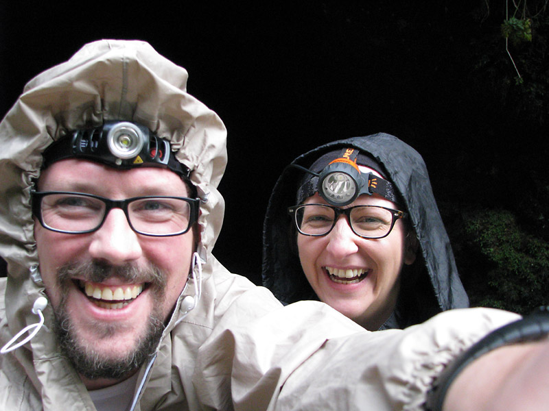 Schon vor dem langen Tunnel müssen einige kürzere Exemplare durchquert werden. Das kennen wir schon von gestern. Da es in den Tunneln tüchtig tropft, hat man die ganze Zeit die Regenjacke an.
