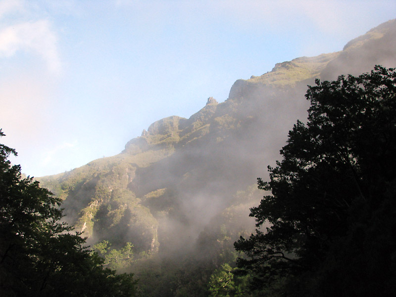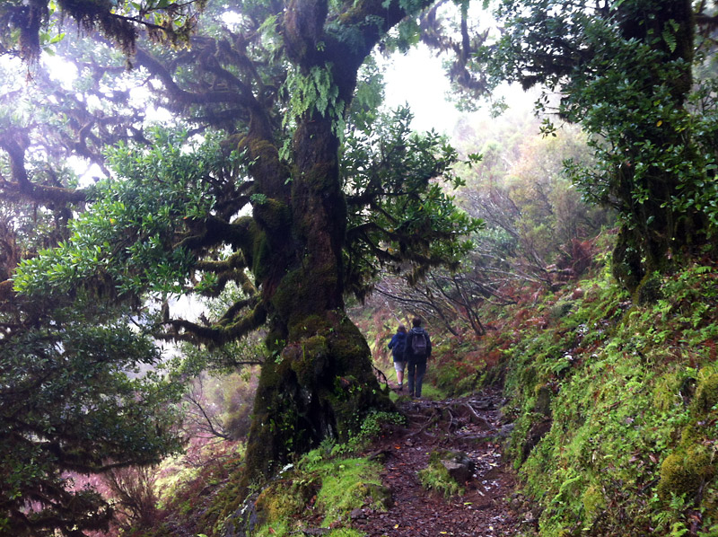 Am fünften Tag sieht das Wetter in den Bergen endlich freundlich aus. Wir wollen das Highlight der Reise machen: Eine Wanderung zum Caldeirão do Inferno mit vorherigem knackigen Anstieg und zweimaliger Durchquerung eines zweieinhalb Kilometer langen Levadatunnels. Los geht es an einem Elektrizitätswerk. Die Anfahrt war schon nicht ohne; der Wanderführer empfiehlt dazu Allrad. Aber der Peugeot macht das auch. Vom Parkpunkt aus muss jetzt erst einmal ein 300-Meter-Anstieg zum eigentlichen Levadaweg absolviert werden. Wir haben Trekkingstöcke immer für überflüssig gehalten. Jetzt sind wir froh, dass wir uns welche geliehen haben. Steil geht es die Serpentinen bergauf. Wir kommen an den angeblich ältesten Bäumen Madeiras vorbei. Die Wurzeln des Stinklorbeers sollen noch aus der Zeit der Besiedelung stammen.