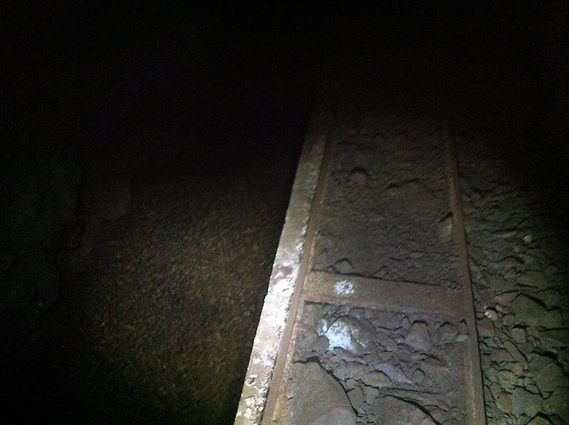 Mitten im Tunnel liegt ein Cache (GC1EFF5). Den wollen wir natürlich loggen. Zuerst laufen wir daran vorbei, aber im zweiten Anlauf klappt es. Die gut zweieinhalb Kilometer sind ganz schön anstrengend. Das Geröll und die maroden Schienen der alten Lorenbahn machen das Fortkommen nicht gerade einfach. Es gibt auch niedrige Stellen und ich haue mir mehrfach den Kopf an. Der @geohamelenser meinte dazu nur: „Wer sich da nicht den Kopf einmal angehauen hat, der war nicht wirklich drin.“