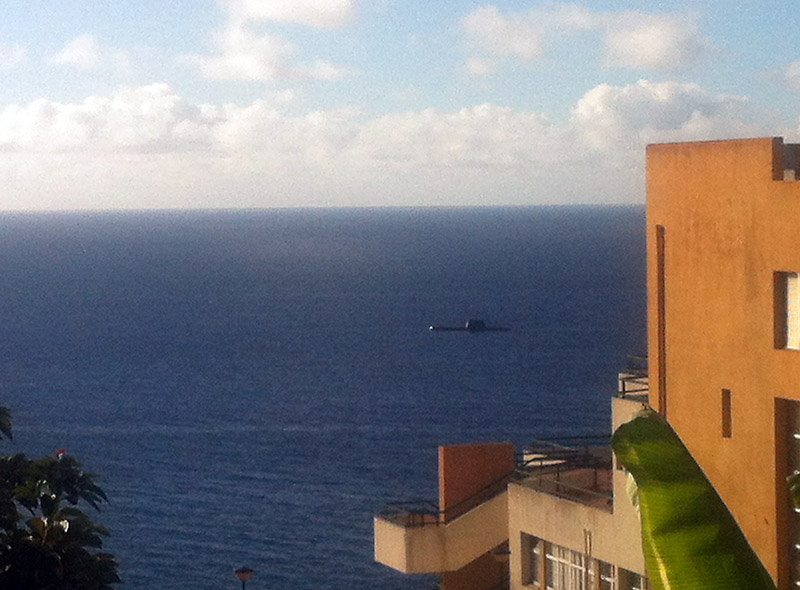 Am nächsten Morgen hat sich ein U-Boot der portugiesischen Flotte vor unser Frühstücksfenster verirrt. Später sehen wir, dass es von einem Lotsenboot abgeholt wird.