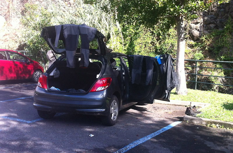 Am Schalter von Guerin Rent a Car möchte man uns übers Ohr hauen. Die Insel wäre sehr steil und für einen Diesel müssten wir nur €20 Aufpreis zahlen. Ich lehne ab und meine, es würde schon gehen. Darauf kommt nur „I’ll give you a diesel anyway…“. Es ist nämlich gar kein anderes Auto mehr da. Es handelt sich dabei um einen Peugeot 207. Jedes größere Auto ist auf der Insel auch fehl am Platze. Als wir den Mietwagen in Empfang nehmen, ist es bereits dunkel.