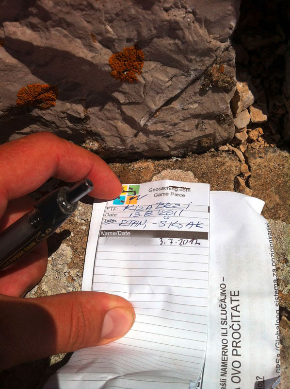 Mitten im Tunnel liegt ein Cache (GC1EFF5). Den wollen wir natürlich loggen. Zuerst laufen wir daran vorbei, aber im zweiten Anlauf klappt es. Die gut zweieinhalb Kilometer sind ganz schön anstrengend. Das Geröll und die maroden Schienen der alten Lorenbahn machen das Fortkommen nicht gerade einfach. Es gibt auch niedrige Stellen und ich haue mir mehrfach den Kopf an. Der @geohamelenser meinte dazu nur: „Wer sich da nicht den Kopf einmal angehauen hat, der war nicht wirklich drin.“