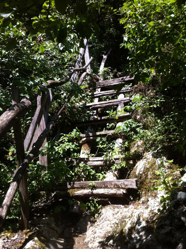 Am fünften Tag sieht das Wetter in den Bergen endlich freundlich aus. Wir wollen das Highlight der Reise machen: Eine Wanderung zum Caldeirão do Inferno mit vorherigem knackigen Anstieg und zweimaliger Durchquerung eines zweieinhalb Kilometer langen Levadatunnels. Los geht es an einem Elektrizitätswerk. Die Anfahrt war schon nicht ohne; der Wanderführer empfiehlt dazu Allrad. Aber der Peugeot macht das auch. Vom Parkpunkt aus muss jetzt erst einmal ein 300-Meter-Anstieg zum eigentlichen Levadaweg absolviert werden. Wir haben Trekkingstöcke immer für überflüssig gehalten. Jetzt sind wir froh, dass wir uns welche geliehen haben. Steil geht es die Serpentinen bergauf. Wir kommen an den angeblich ältesten Bäumen Madeiras vorbei. Die Wurzeln des Stinklorbeers sollen noch aus der Zeit der Besiedelung stammen.