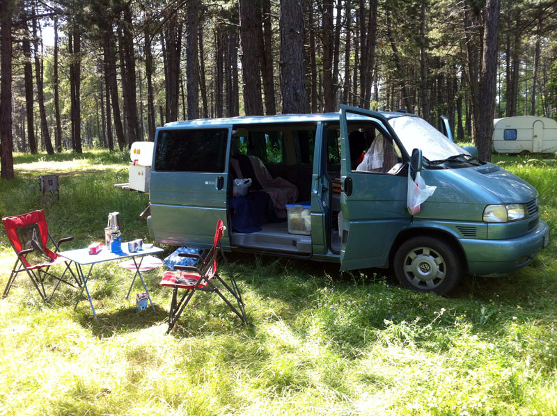 Recht früh morgens brechen wir von unserem Hotelcamp auf und fahren auf die Autobahn in Richtung serbischer Grenze. Der Wärter in der Mautstation nimmt unser Ticket entgegen und runzelt die Stirn. Es handelt sich um die selbe Mautstation, an der wir in der anderen Richtung das Ticket gezogen haben. Diesen Fall sieht das kroatische Autobahnsystem nicht vor. Er bedeutet uns, wir sollen wenden. Wenden? Auf der Autobahn? Es ist sehr wenig los aber schon hat sich jemand hinter uns eingereiht. Der wird sogleich vom Wärter verscheucht und uns gegenüber wird er mit der Wendegeste deutlicher. „Naja“, denke ich mir, „Geisterfahrer warst du auch noch nicht“ und wende den Bulli. Einige hundert Meter fahren wir nun entgegengesetzt. Von Ferne sehen wir einen LKW nahen, sonst ist kein Verkehr. Es gibt auf diesem Abschnitt keine Mittelleitplanke, aber die Fahrbahnen sind mit einer Art Bojen getrennt, zwischen denen eine Schnur gespannt ist. Ich suche eine Stelle, an der man dort vielleicht drüberfahren kann. Geht aber nicht. Ein ganzes Stück weiter, die Mautstation ist schon ganz klein im Rückspiegel, beginnt die Mittelleitplanke. Und genau dort hat man eine Fahrzeugbreite freigelassen. Puh! Also nicht die acht Kilometer bis zur nächsten Ausfahrt als Falschfahrer, sondern wieder auf der richtigen Seite. Dort angekommen zahlen wir einige Kuna für den Abschnitt und wollen jetzt auf der Nebenstrecke bis Lipovac fahren. Dahinter ist die Autobahn bis zur Grenze mautfrei, das wissen wir von gestern. Also folgen wir der Straße, die auf unserer Papierkarte ist. Die wird schon nach kurzer Zeit zur Schotterpiste. Wir machen die Rüttelstrecke ein paar Kilometer mit, ein Wildschwein kreuzt unseren Weg, dann erreichen wir einen Bootsanleger. Dahinter ist der Weg, der zwischenzeitlich immer schmaler geworden ist, komplett überwachsen. Ich wende, wir haben die Schnauze voll und fahren wieder auf die Autobahn. Am Schalter sitzt immer noch der selbe Typ, nimmt unser Ticket und wundert sich offensichtlich, was wir so lange gemacht haben.